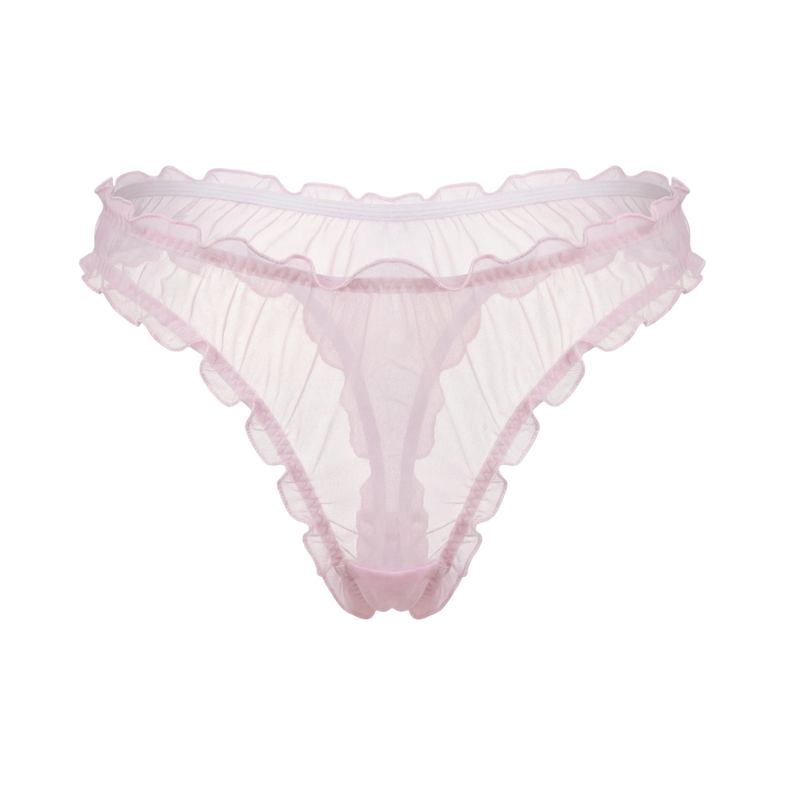 The Alevy Ruffle Thong is crafted from soft stretch tulle, offering a super stretchy, comfortable fit. The delicate ruffles add a playful touch, making this thong both sweet and flattering.